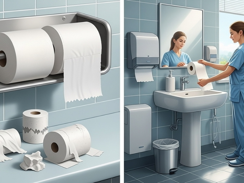 Một trong những sai lầm nghiêm trọng nhất là vì muốn tiết kiệm ngân sách, nhiều đơn vị đã chọn giấy vệ sinh cuộn lớn làm từ nguyên liệu tái chế, không rõ nguồn gốc. Loại giấy này tuy có giá rẻ hơn nhưng thường đi kèm chất lượng kém: dễ mục, nhanh rách, có bụi giấy, thậm chí còn tồn dư hóa chất tẩy rửa mạnh hoặc mùi khó chịu. Điều này không chỉ ảnh hưởng đến trải nghiệm của người dùng, mà còn có thể gây kích ứng, dị ứng – đặc biệt nguy hiểm với người bệnh có làn da nhạy cảm hoặc đang điều trị sau phẫu thuật.