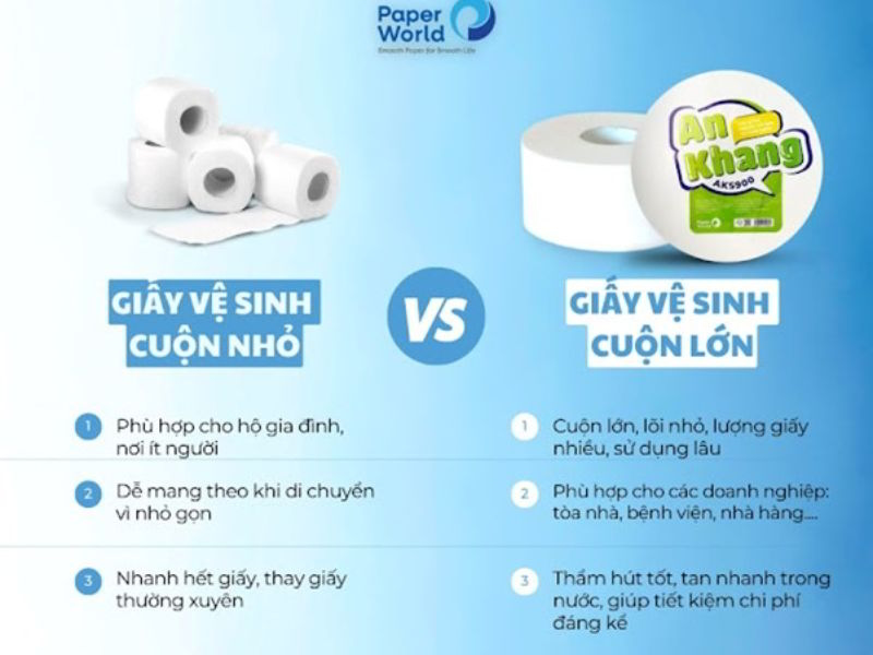 Khi đặt lên bàn cân giữa giấy vệ sinh cuộn lớn và giấy vệ sinh cuộn nhỏ, có thể thấy rõ sự khác biệt về chi phí sử dụng, hiệu suất và khả năng bảo quản. Mặc dù giá một cuộn giấy lớn cao hơn một cuộn nhỏ, nhưng tính theo đơn vị mét hoặc thời gian sử dụng, giấy cuộn lớn lại mang lại giá trị vượt trội.