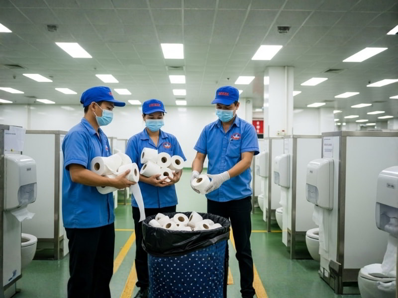 Không giống như văn phòng thông thường hay các cửa hàng nhỏ lẻ, nhà máy là nơi có hàng trăm đến hàng nghìn nhân viên hoạt động theo ca, suốt 8–12 tiếng mỗi ngày. Mỗi người sử dụng nhà vệ sinh trung bình 2–3 lần/ngày, tức là tổng lượt sử dụng có thể lên đến hàng ngàn lượt/ngày. Với tần suất đó, việc chọn giấy vệ sinh cuộn nhỏ là hoàn toàn không phù hợp.