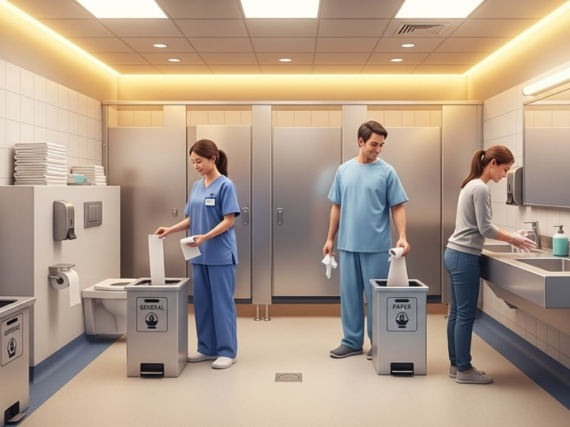 Để khắc phục, các phòng khám cần trang bị thùng rác chuyên dụng, đặt ở vị trí dễ thấy, thuận tiện nhất trong mỗi buồng vệ sinh. Nên chọn thùng rác: