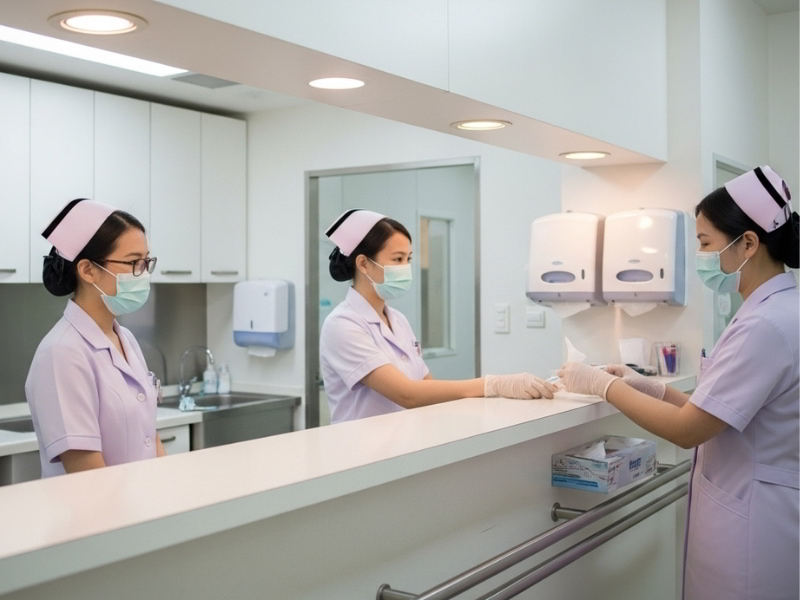 Khu vực rửa tay là một trong những khu vực quan trọng không chỉ trong phòng khám mà còn trong tất cả các cơ sở y tế. Ở đây, khăn giấy lau tay cần phải đáp ứng các yêu cầu về thấm hút nhanh và dễ dàng sử dụng mà không gây lãng phí. Các loại giấy lau tay chuyên dụng, thường là giấy khô 2 lớp hoặc 3 lớp, có khả năng thấm hút nhanh và được thiết kế để dùng trong môi trường vệ sinh, giúp giảm thiểu vi khuẩn và tăng cường bảo vệ sức khỏe.