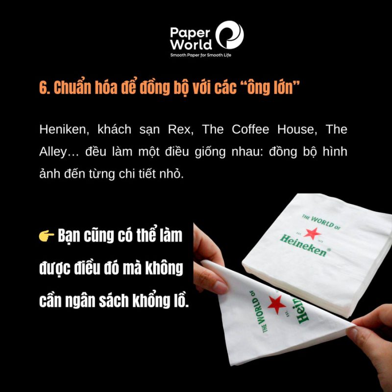 - Khăn giấy trắng trơn dễ gây cảm giác đơn điệu; ngược lại, khăn giấy in logo tạo cảm giác “được phục vụ đúng chuẩn”.