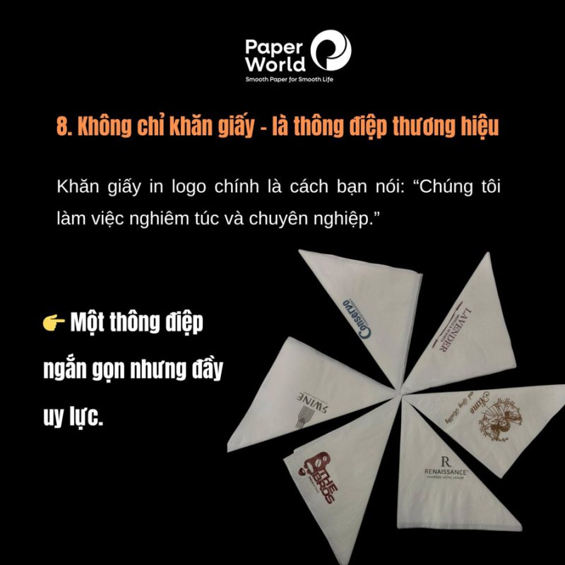 - Khăn giấy là vật dụng thiết yếu trong mọi bữa tiệc, hội thảo, họp báo → logo dễ dàng tiếp cận người dùng mà không cần “xin chú ý”.