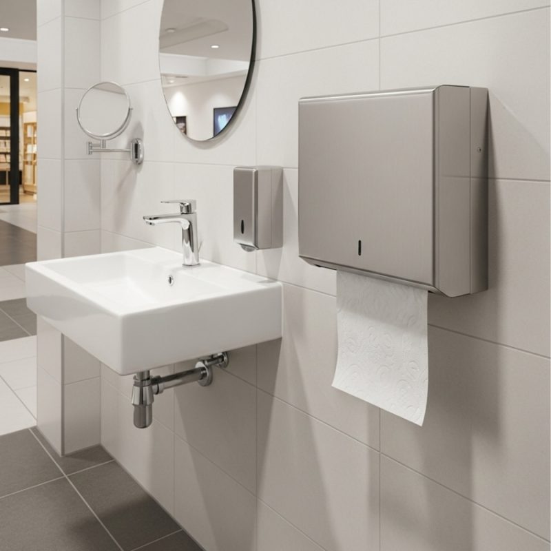 - Nhà vệ sinh công cộng: Đối với các khu vực nhà vệ sinh có lưu lượng người sử dụng cao, khăn giấy lau tay công nghiệp dạng V/Z hoặc cuộn lớn sẽ là sự lựa chọn tối ưu. Những loại giấy này giúp kiểm soát lượng giấy sử dụng và tiết kiệm chi phí.