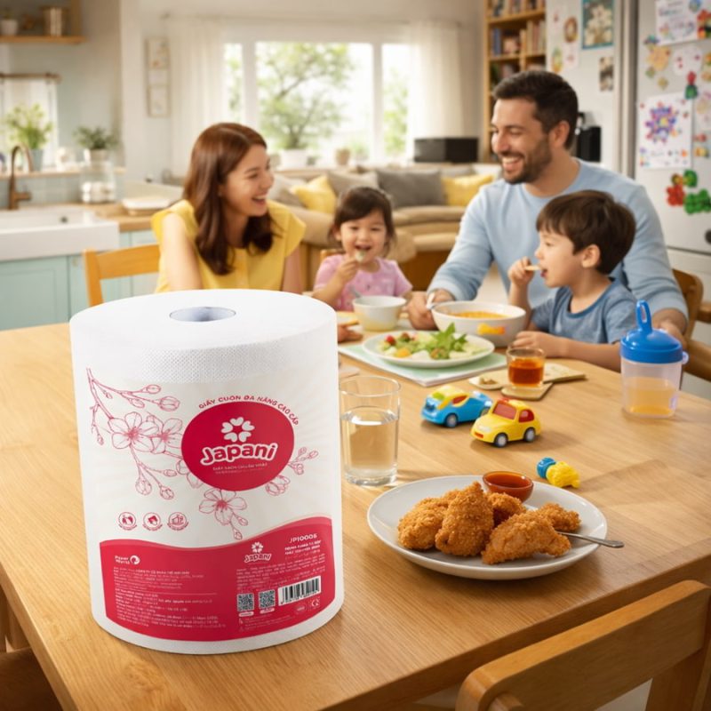 Với các dòng giấy rút Japani 20-2 hoặc giấy cuộn Japani 800M, người dùng dễ dàng đặt vào hộp đựng, tiện dùng và luôn giữ khô ráo cho khu vực bếp, bàn ăn hoặc nhà vệ sinh. Khăn giấy Thế Giới Giấy còn đạt chuẩn “Giấy sạch 5 KHÔNG” – không hóa chất, không bụi, không gây kích ứng da, an toàn cho cả trẻ nhỏ.