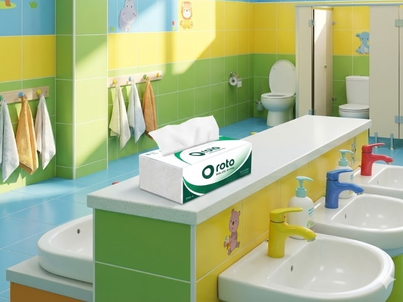 Nên bố trí hộp khăn giấy tại các khu vực vệ sinh chung: bồn rửa tay, cửa lớp, hành lang, khu ăn uống.