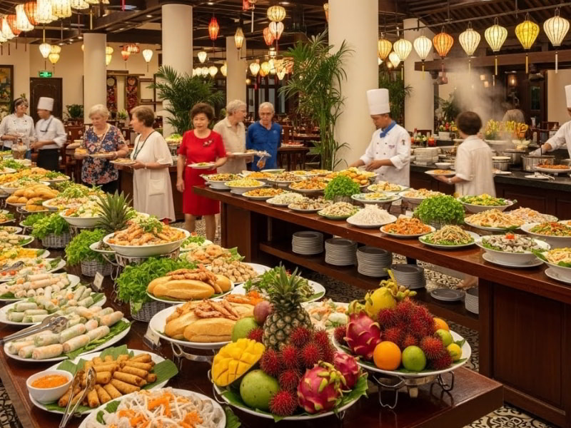 Có thể bố trí tại khu lấy đồ ăn, trên bàn ăn hoặc khu vực chờ – giúp khách cảm thấy tiện nghi, sạch sẽ.