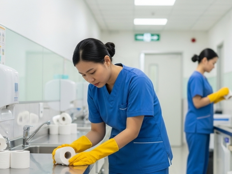 Một trong những tác động gián tiếp nhưng đáng kể nhất của việc sử dụng giấy vệ sinh cuộn nhỏ trong môi trường phòng khám là tăng gánh nặng vận hành cho đội ngũ vệ sinh. Vì cuộn giấy nhỏ nhanh hết, nhân viên vệ sinh buộc phải kiểm tra, thay giấy liên tục mỗi ca – thậm chí trong giờ cao điểm có thể phải thay từ 3–5 lần/ngày/buồng.